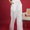 Add a touch of elegance to your wardrobe with our White Embroidered Bell-Bottom Pants. Crafted from 100% natural cotton, these pants provide exceptional comfort and a breathable fit, making them an ideal choice for all-day wear. The striking bell-bottom silhouette is accentuated with intricate self-embroidery at the hem, adding a subtle yet sophisticated detail that sets these pants apart.