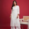 The kurta features intricate eyelet embroidery all over, adding a touch of elegance and grace to your look. Designed with a handmade croccia button-down front, it offers a modern twist to traditional attire. The round neckline and full sleeves ensure a comfortable fit, while the delicate lace detailing on the sleeves adds a subtle charm.