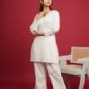 Keeping it chic and effortless in all-white vibes. This all-white Kurti features a flattering bell shape, adorned with intricate lace on the neck and sleeves is a perfect blend of grace and sophistication. From the delicate embroidery to the small gathers at the cuffed sleeves, every detail tells a story of classic beauty and refined style. Paired effortlessly with matching pants, it’s an embodiment of pure, understated luxury.